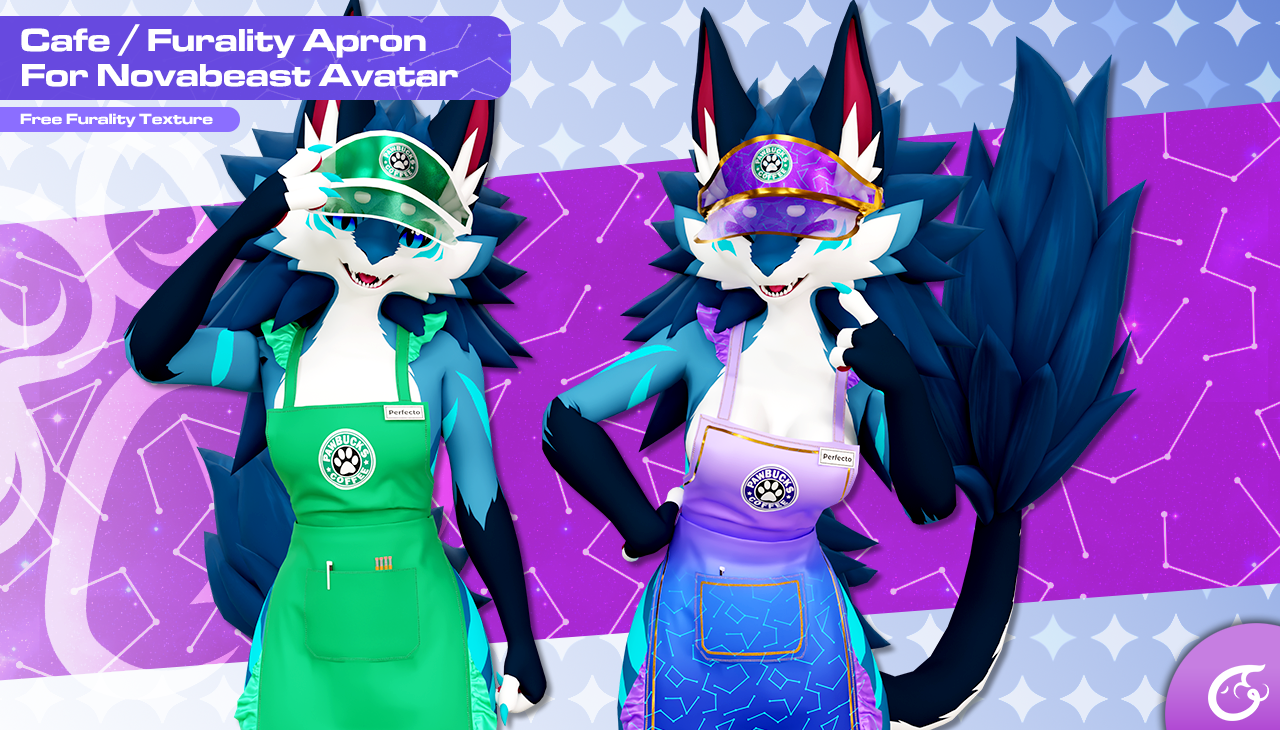 Like I always say, Nova can take up any role. How about now you guys play the role of the hot barista guy or gal at your favourite cafe? Here's my newest creation: an awesome customisable apron and a cap that reflects the cafe's brand. There's a special Texture version I made for Furality that can be worn, volunteer for being a Furality-themed Barista, hehe.