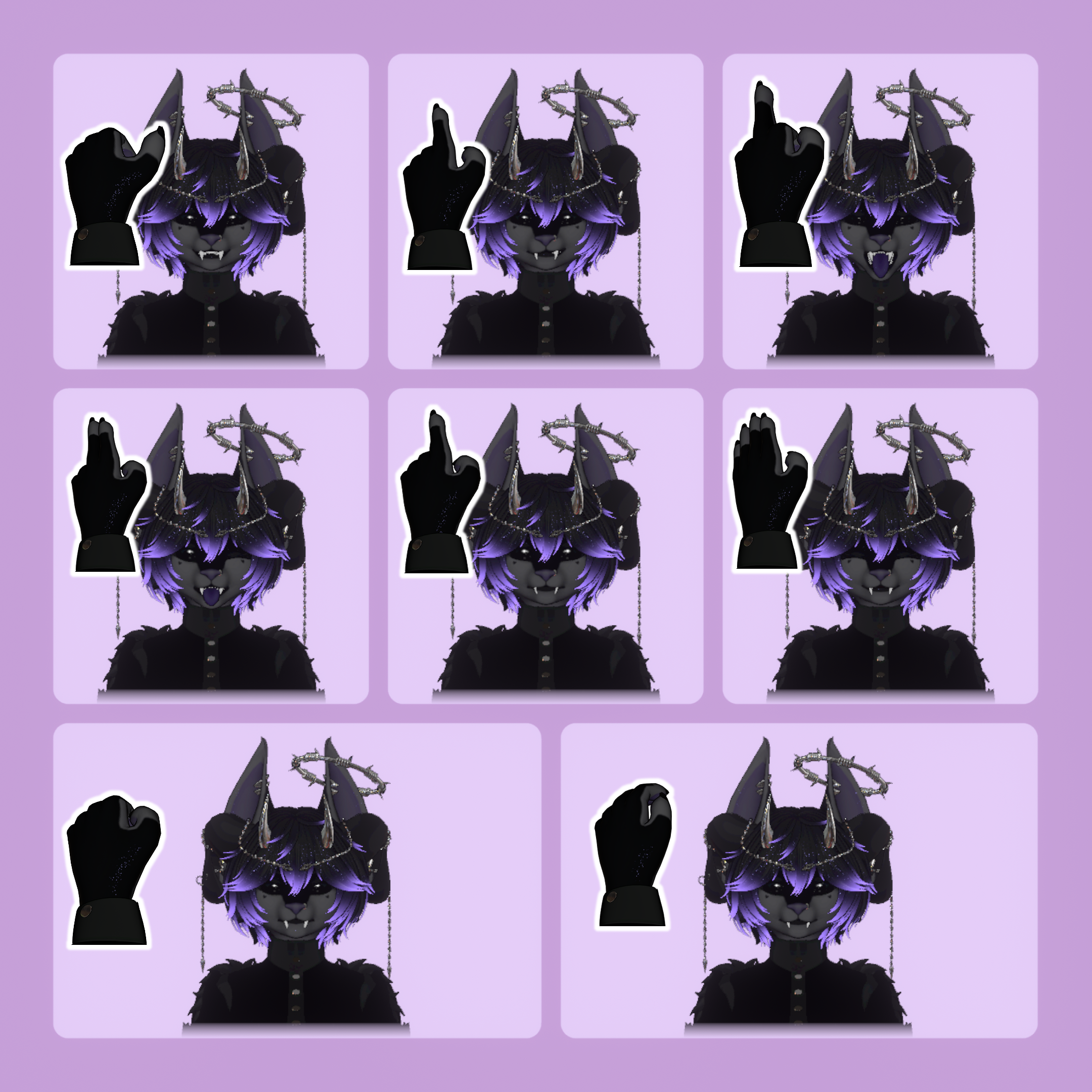 Right hand gestures -> happy, happy eyes closed, mad, sad, silly, smug, tongue